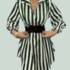 Stay stylish and confident in this striped button-down midi dress. Its tailored fit, collared neckline, and lightweight fabric make it perfect for a modern professional wardrobe. Pair with pumps for a classic office look or add a belt for a touch of sophistication.